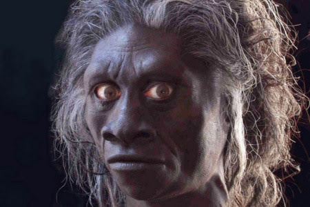 Это реконструкция по черепу, который нашли в пещере на острове Флорес, Индонезия. Рядом со скелетом нашли примитивные инструменты. Черепу 97 тыс. лет, если не врут. В сети его даже назвали хоббитом. Можете загуглить: «хоббит с острова Флорес». Существо признано человеком, несмотря на очень маленький рост и объем черепной коробки. Эта ветвь оказалась тупиковой – аналогов в современных расах нет.
